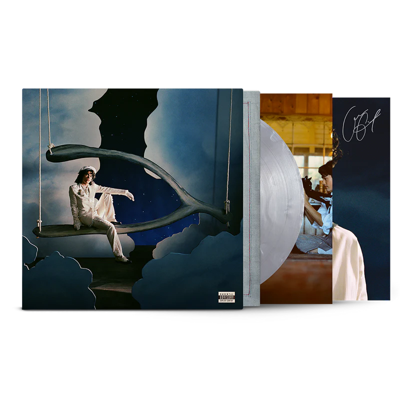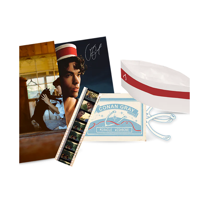 Wishbone, the fourth album by Conan Gray. The Shooting Star Edition Signed LP includes a silver marble vinyl and 16x20” poster featuring an exclusive photo of Conan and Wishbone the Cat.